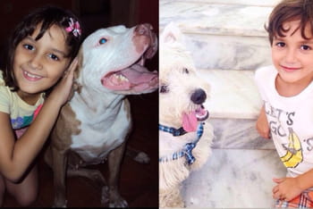 Mylena, hoje com 11 anos, e seu pitbull. Ao lado, o menino Francisco, 6 anos, com seu cachorrinho Luke.